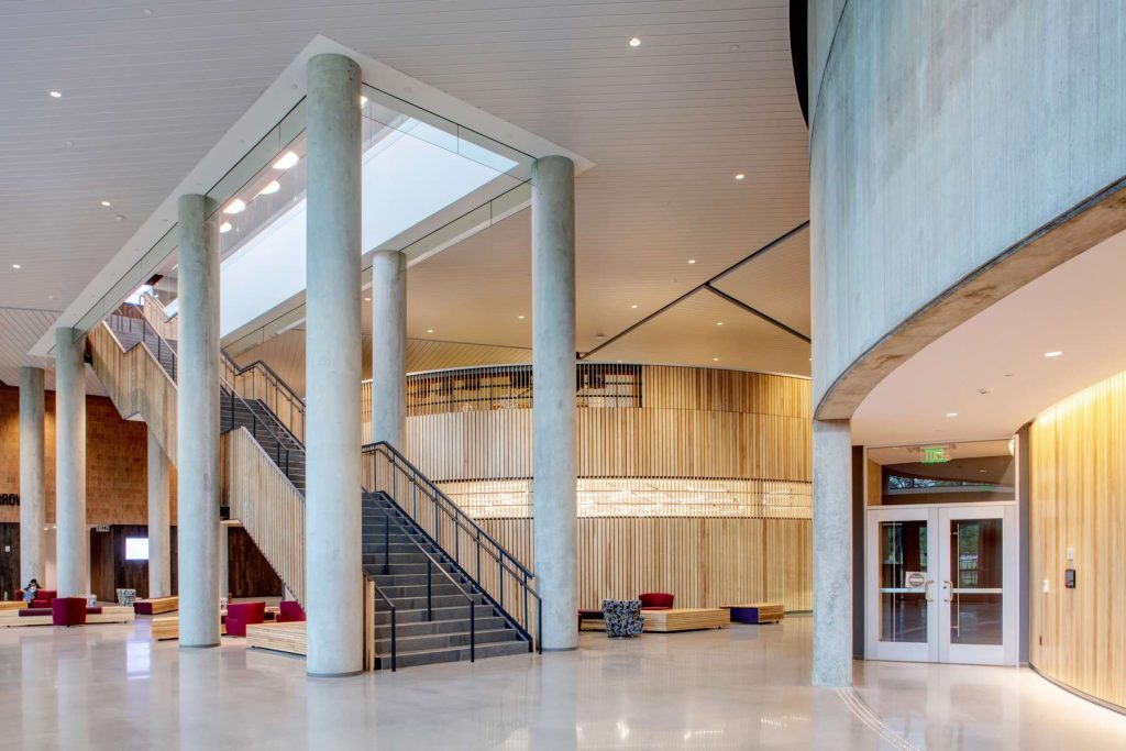 The Lobby serves as an entry and gathering space, accommodating a wide range of informal seating and study areas. The Lobby connects to a large outdoor covered space and lawn and provides direct access to the Market. Two classrooms are immediately accessible from the Lobby – the Large Arena and the Egg Classroom.