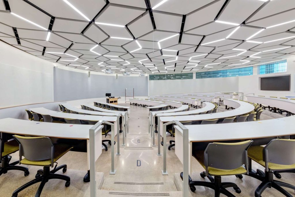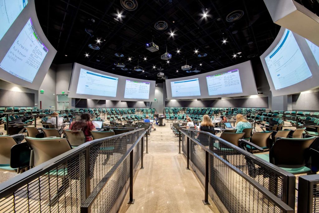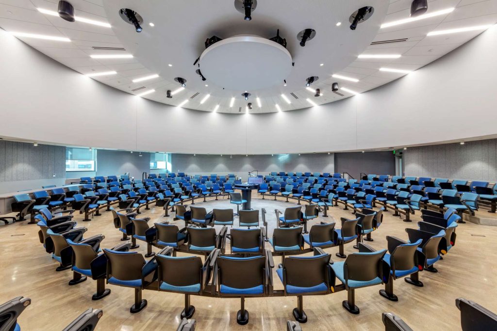Three (200, 400, and 600 student fixed seats) arena-style classrooms provide a unique 360º instructional environment. The Arenas are equipped for lecture recording/broadcasting, live webcasting, and interactive distance learning.
