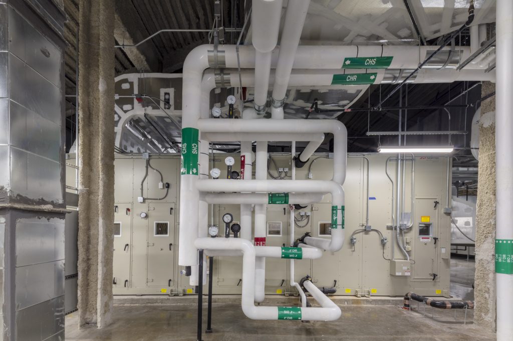 Building chilled water is generated by energy efficient air-cooled chillers. The chilled water system is configured in a primary/secondary flow pumping system designed to save on pump energy during part load operation. Piping provisions were made to connect to a future campus thermal loop.