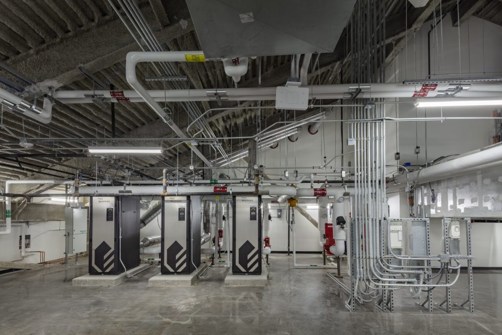 The new plumbing systems in the building served fixtures in restrooms, a café/kitchen, and break rooms throughout the building. Point of use electric water heaters are provided throughout in lieu of a central water heating system. Tank type electric water heaters serve the café plumbing fixtures with a circulation loop. Natural gas serves a new generator and hydronic boilers. The water serving the heating water system and café area is softened in the level 1 A gravity grease interceptor is provided outside of the building for the café sanitary waste. The grease waste piping is heat traced and insulated through an underground tunnel to the grease trap for maintenance access.